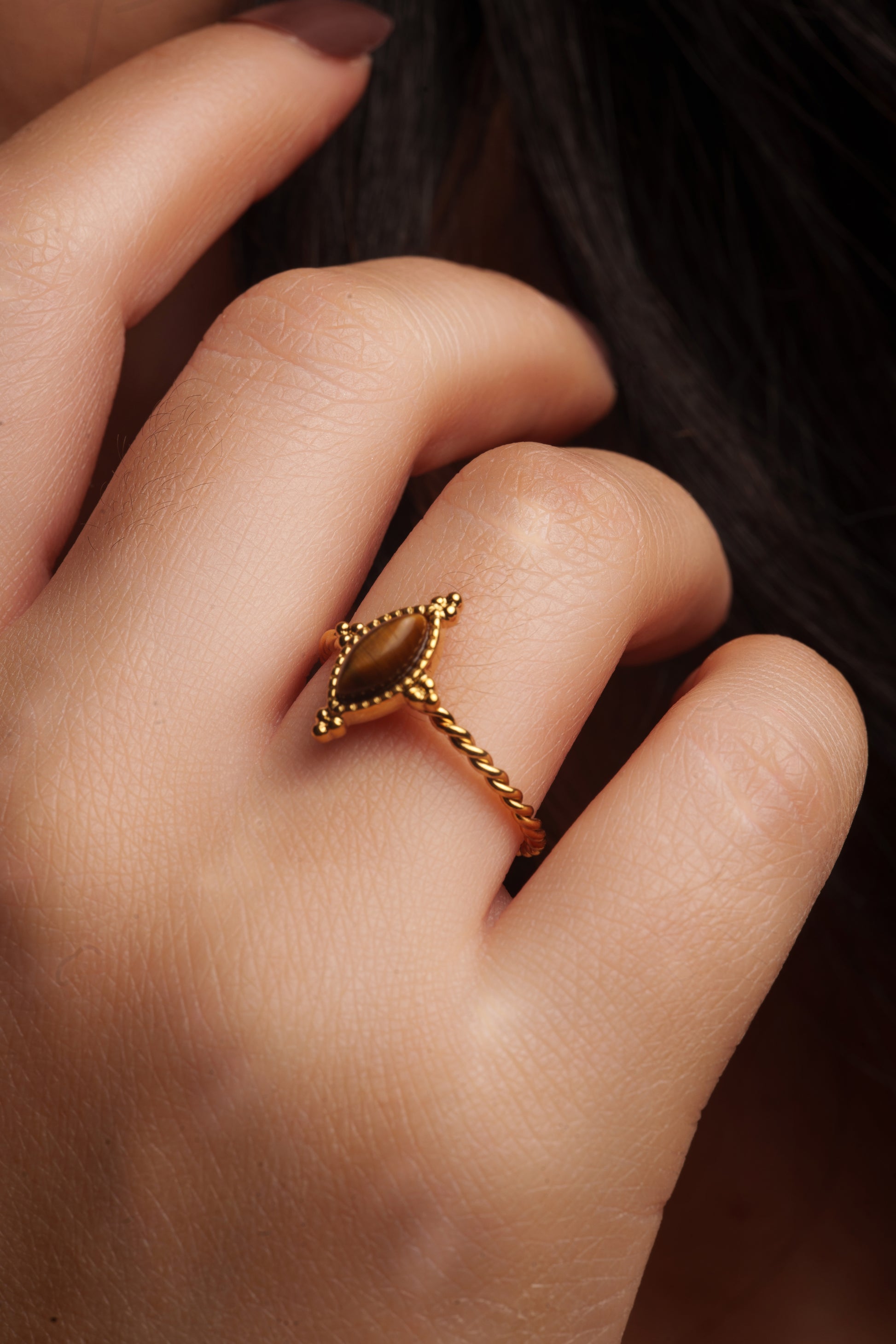 Puissante et solaire, la bague Savane met en valeur une pierre marron aux reflets dorés, symbole de confiance et d'énergie. Son design torsadé lui apporte une touche sauvage et élégante à la fois.