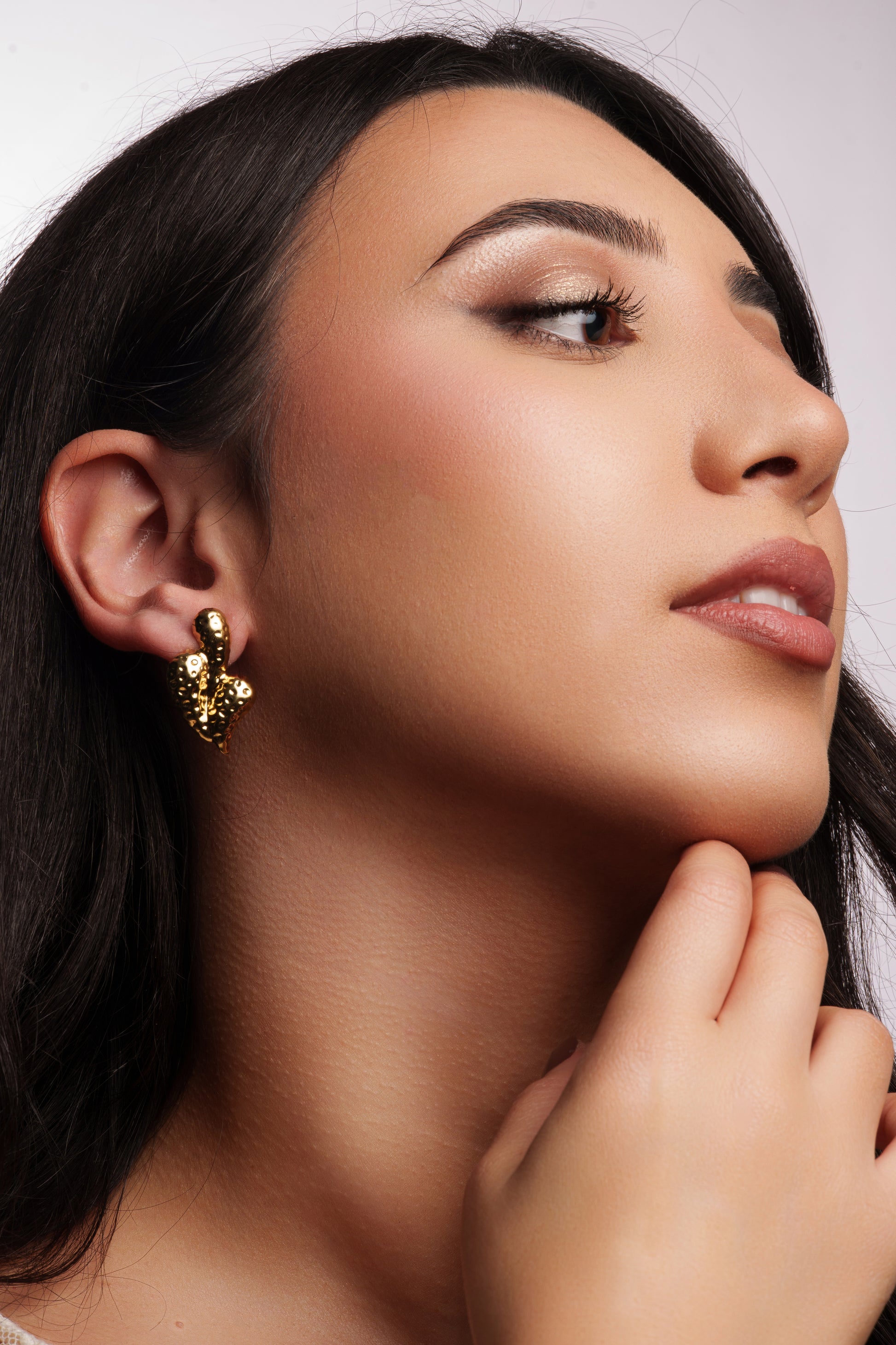 Ces boucles d’oreilles dorées en forme de cactus symbolisent la force et l’élégance des femmes indépendantes.